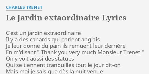 C est un jar din ex tra or di nai re il y a des ca nards qui par lent an glais j leur donn du pain ils re muent leur der rière en m di sant. Le jardin extraordinaire charles trenet c est un jardin extraordinaire il y a des canards qui parlent anglais j leur donne du pain ils remuent leur derrière en disant thank you very much monsieur trenet on y voit aussi des statues qui se tiennent tranquille tout le jour dit on mais moi je sais que dès la nuit venue. Lyrics charles trénet le jardin extraordinaire c est un jardin extraordinaire. Je leur donne du pain ils remuent leur derrière en me disant.